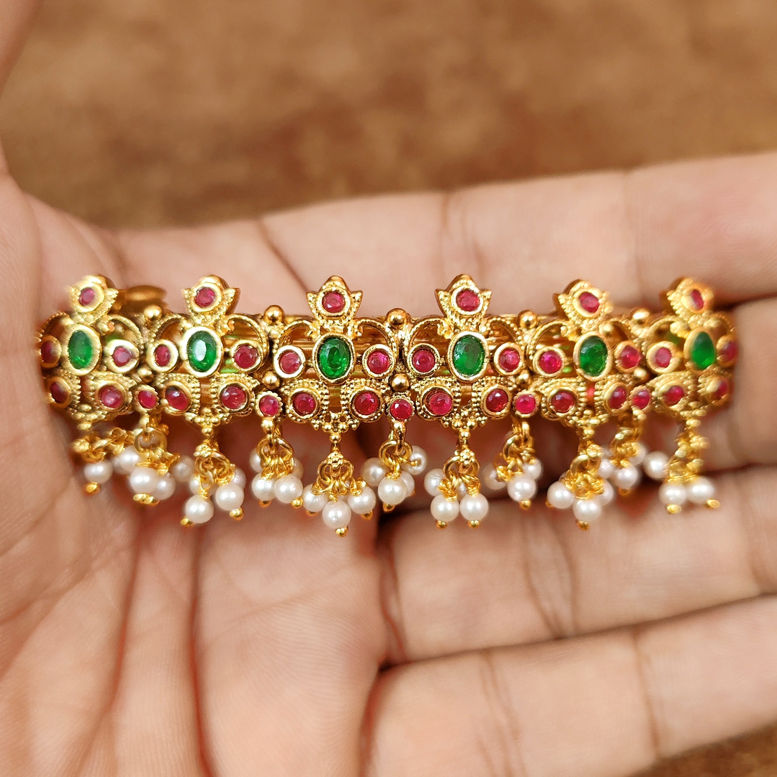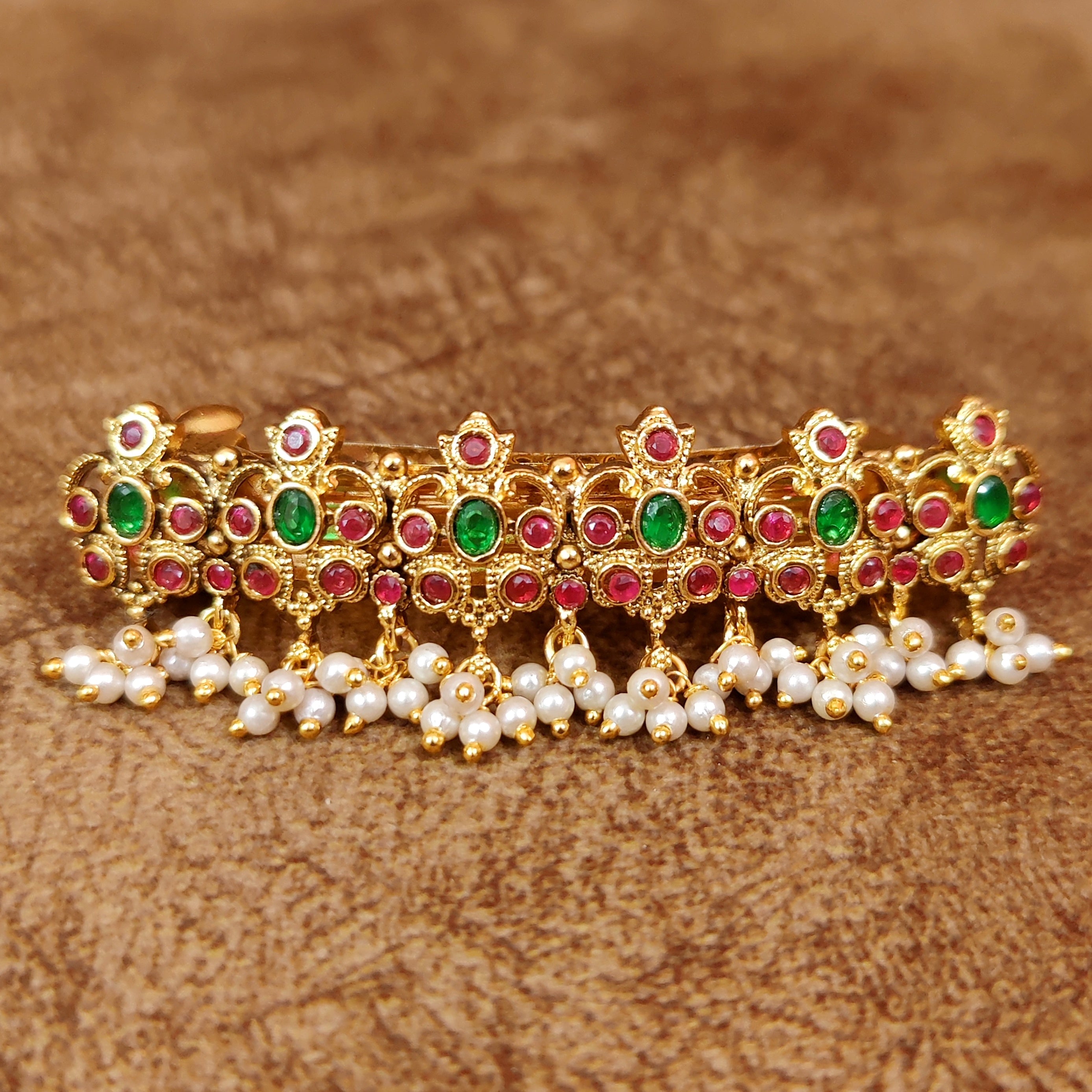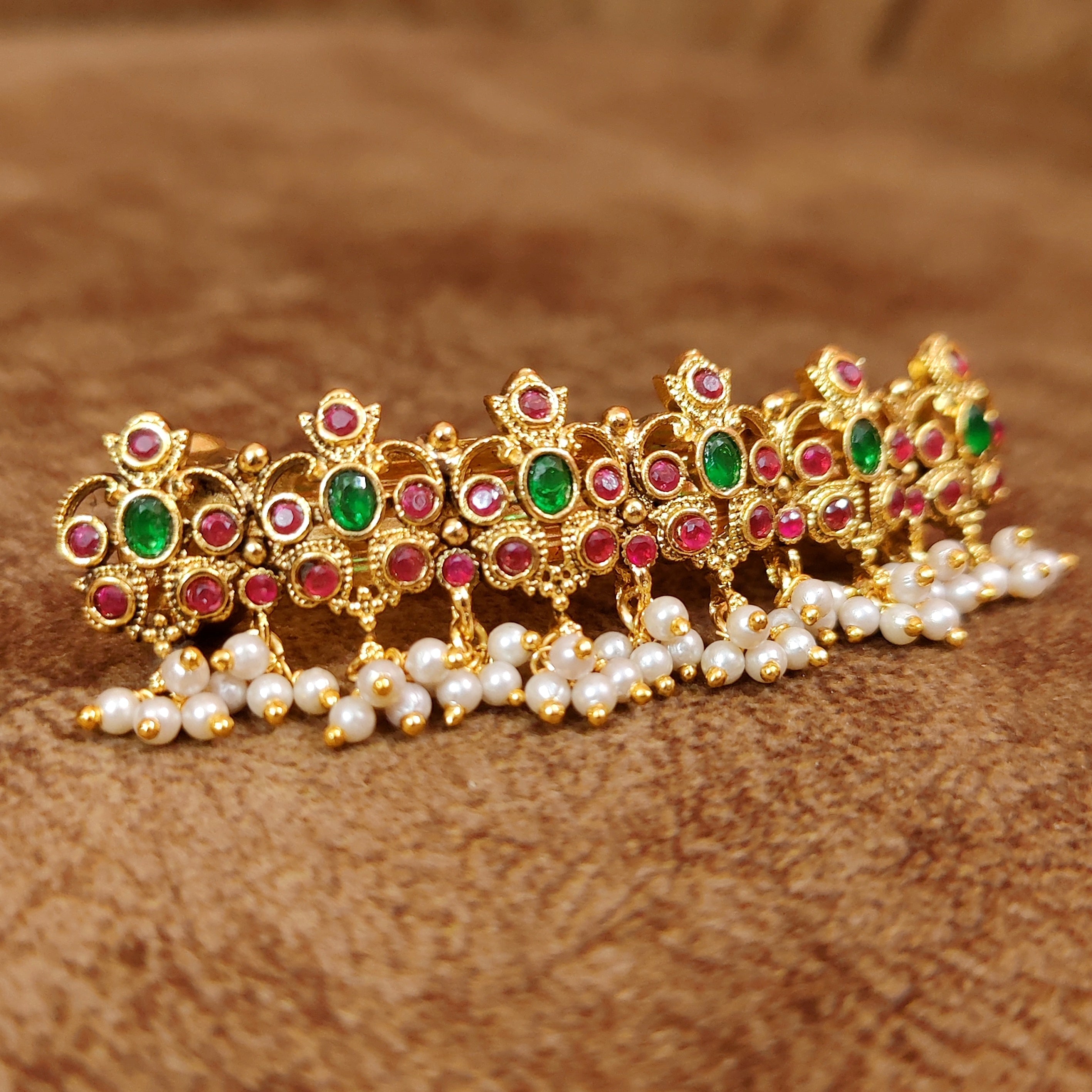 Add a regal touch to your hairstyle with the Ruby & Emerald Antique Gold Plated Pearl Hairclip. This exquisitely designed hair accessory features stunning ruby and emerald-colored stones, set in an antique gold-plated finish for a vintage charm. Delicate pearls enhance its elegance, making it a perfect choice for weddings, festive occasions, or traditional ensembles.
