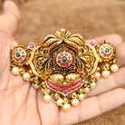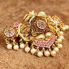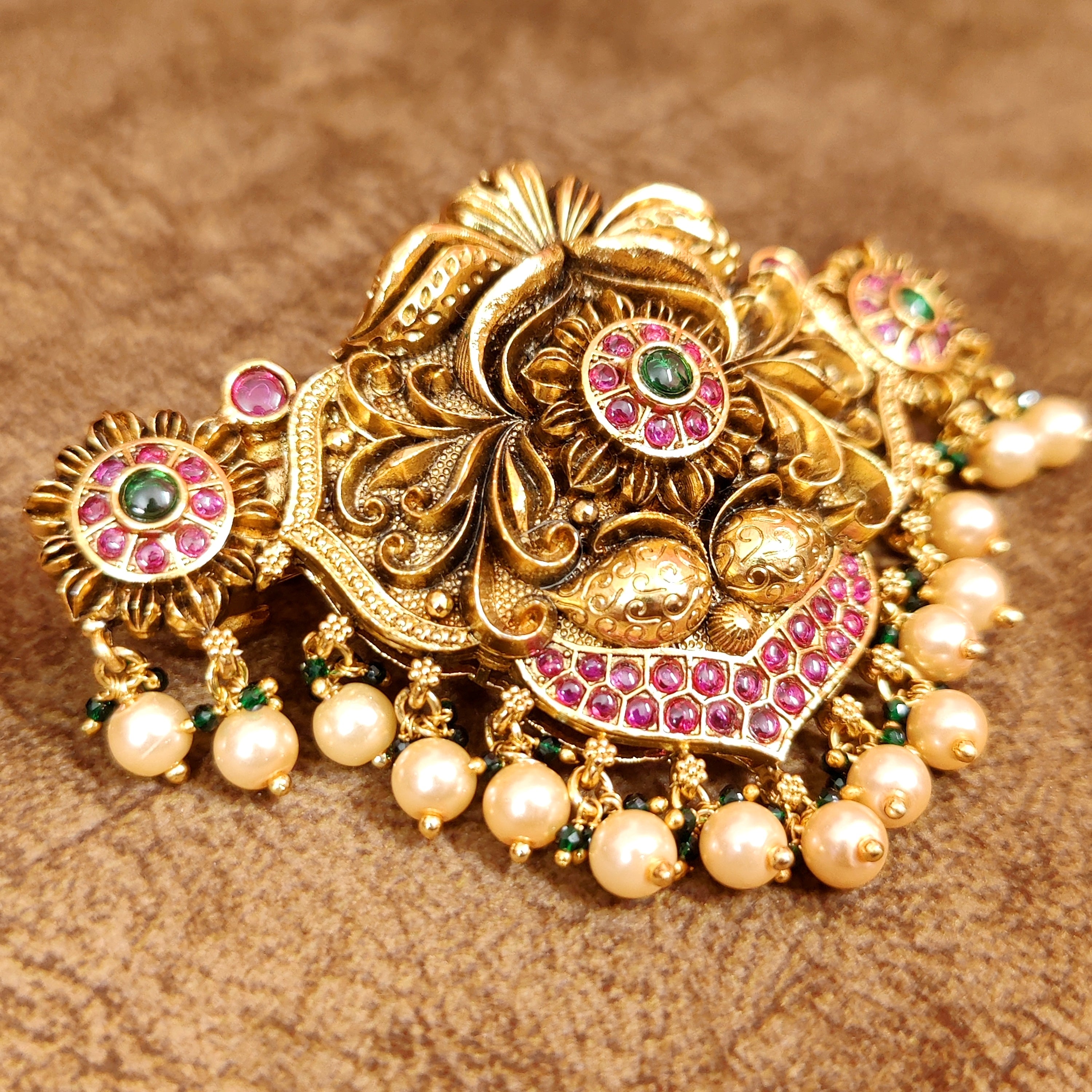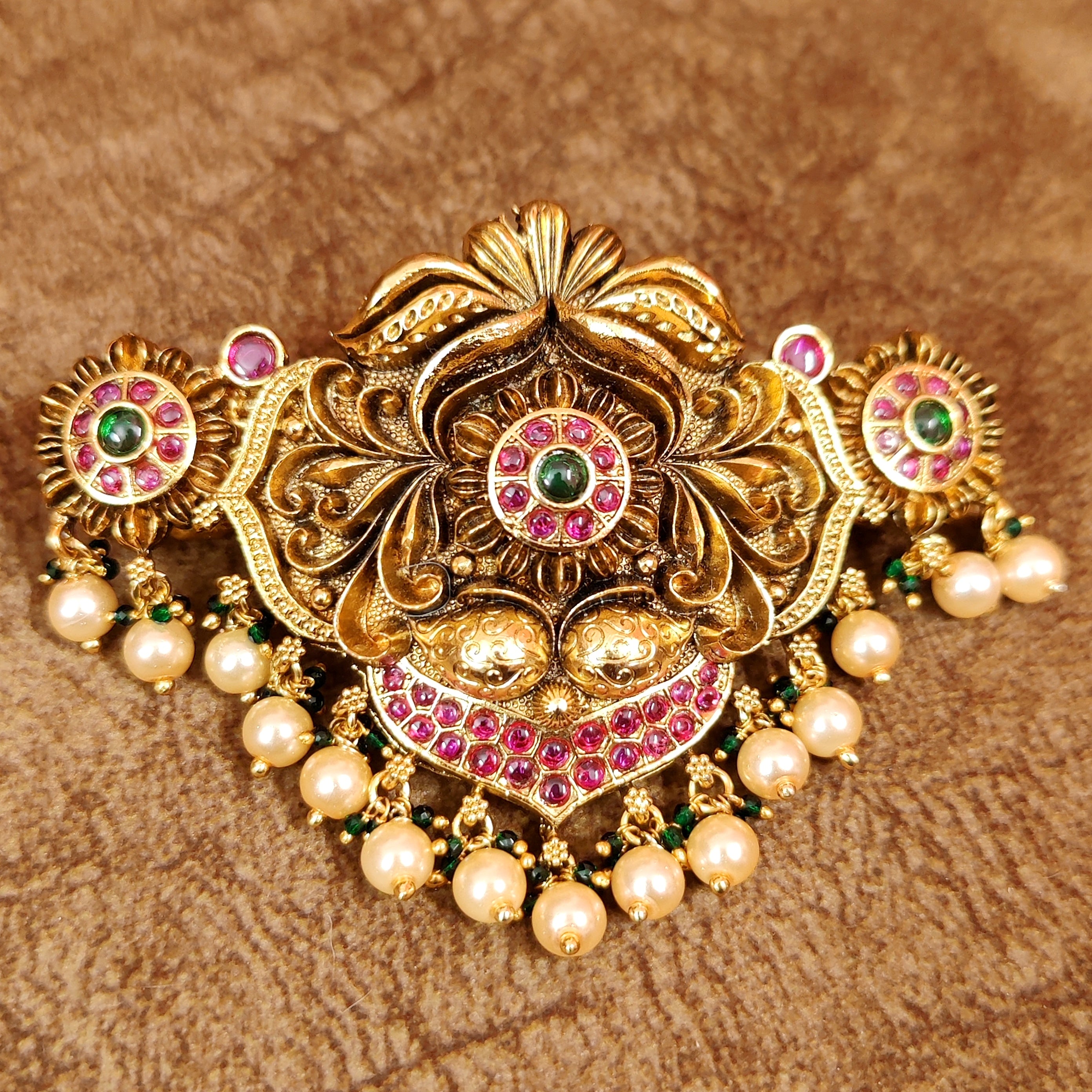 Add a touch of regal elegance to your hairstyle with the Ruby & Emerald Antique Look Real Kemp Stone Hair Clip. This exquisite accessory is adorned with authentic Kemp ruby and emerald stones, set in a finely detailed antique gold finish. Inspired by traditional South Indian jewelry, this hair clip is a must-have for weddings, festive celebrations, and cultural events.