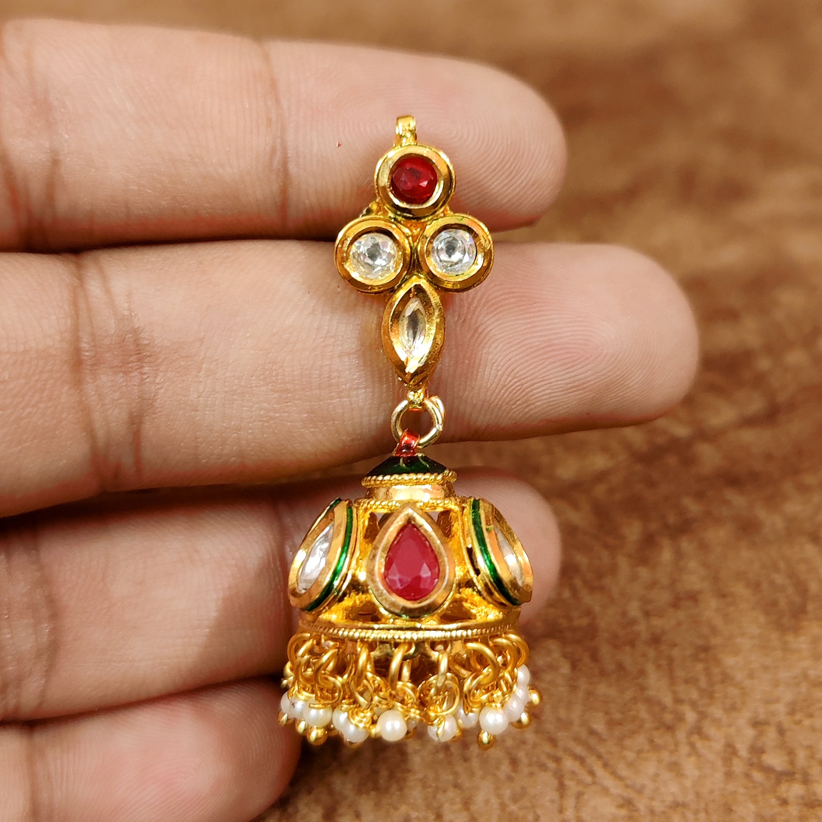Elevate your elegance with these Ruby Kundan Polki Gold Plated Jhumkas from Sanvi Jewels. Featuring radiant ruby Kundan stones and intricate Polki work, these gold-plated jhumkas are perfect for weddings, festivals, and special occasions. Their lightweight design ensures comfortable wear throughout the day. Add a touch of regal charm to your jewelry collection with these exquisite Kundan Polki jhumkas.
