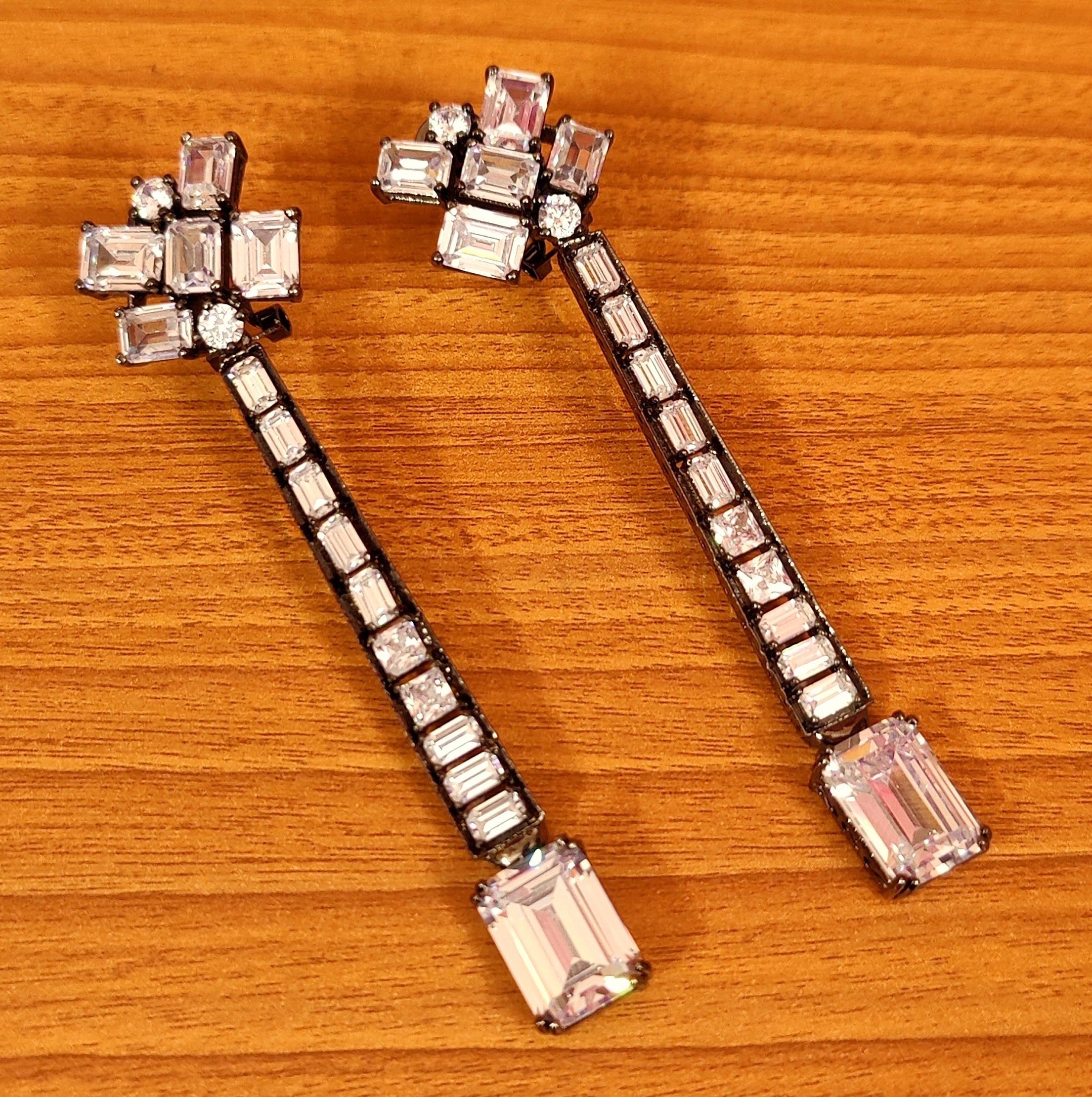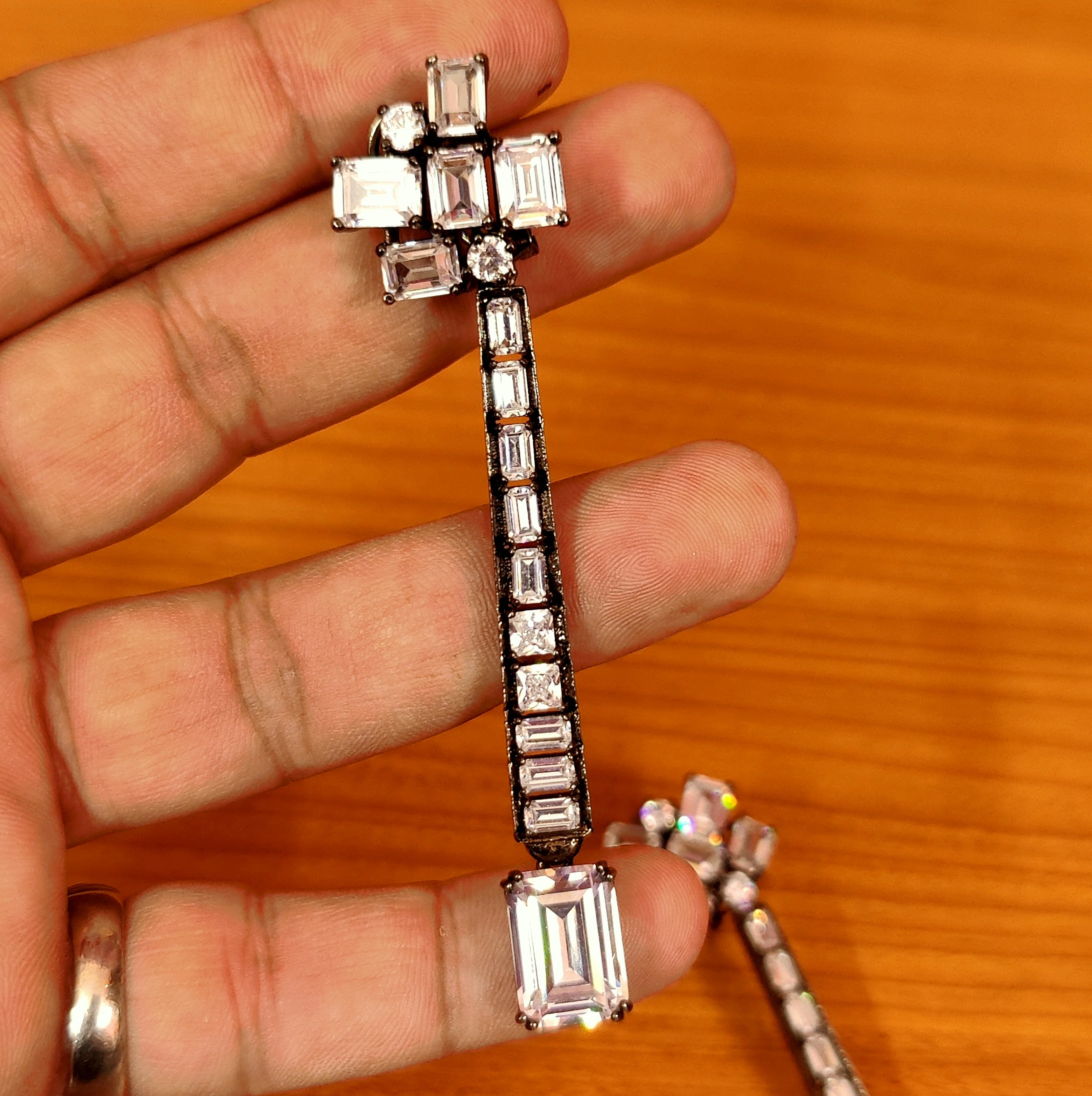 These diamond look earrings are handcrafted in silver alloy with imitation cz signity stones which are of the finest quality of american diamond . These party wear long earrings are handcrafted with different cuts of cz signity stones to perfection and plated with real 18kt fine nickel free black rhodium that gives a real diamond look to the design.
