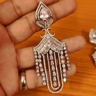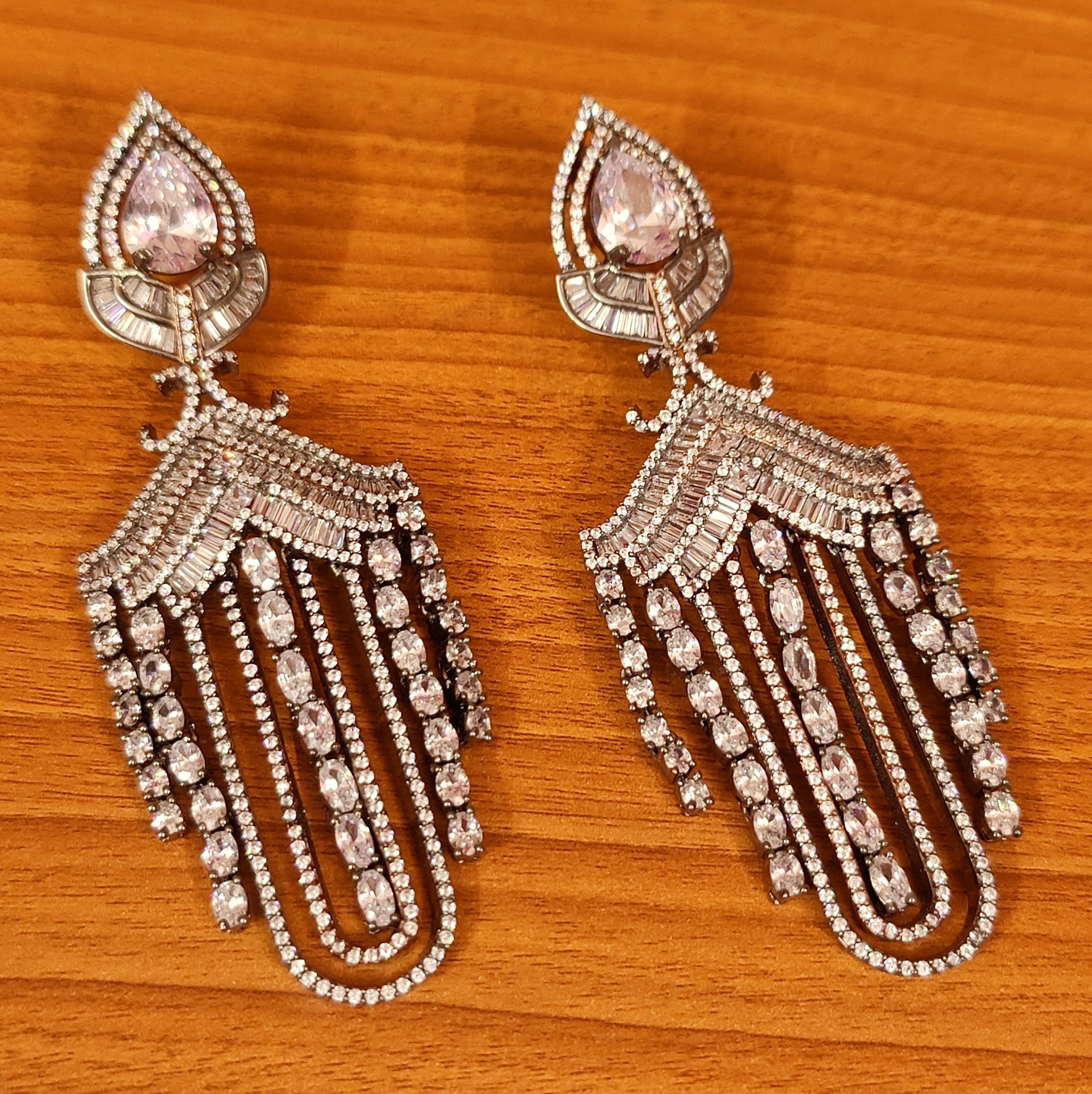 These diamond look earrings are handcrafted in silver alloy with imitation cz signity stones which are of the finest quality of american diamond . These party wear earrings are handcrafted with cz signity stones to perfection with fine setting and plated with real 18kt fine nickel black and silver rhodium that gives a real diamond look to the design.