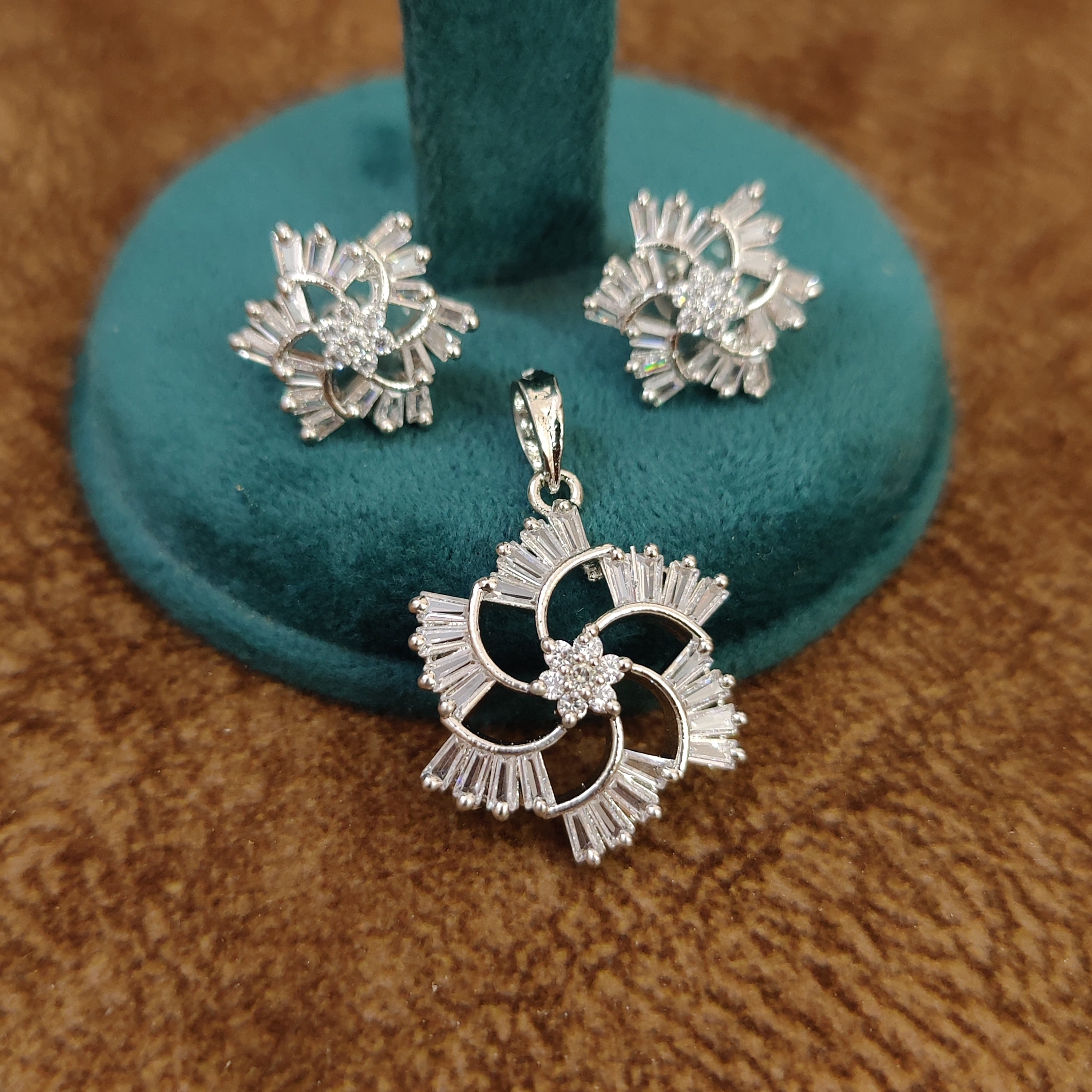 SILVER PLATED DIAMOND LOOK FLORAL PENDANT SET