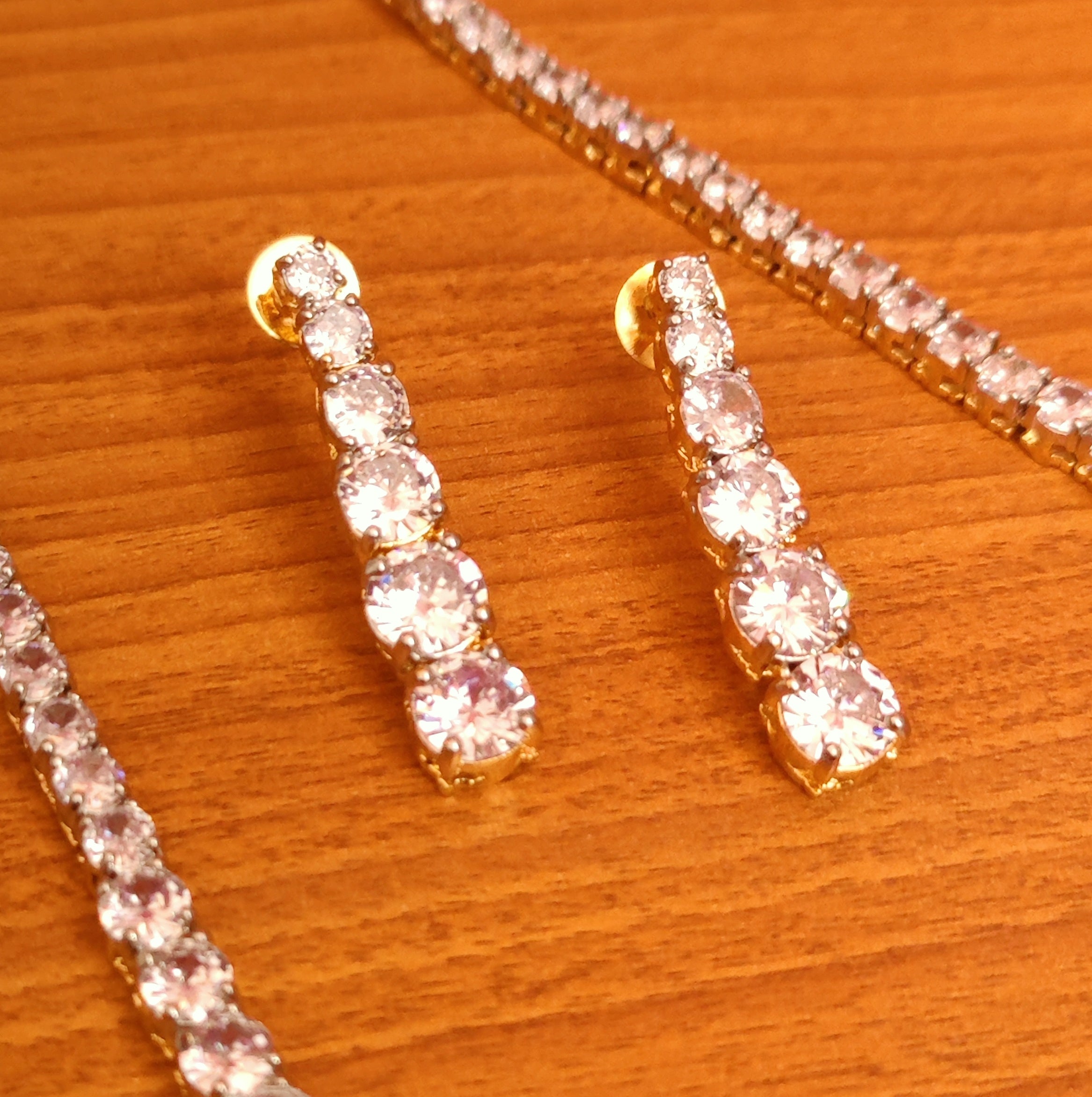This beautiful necklace set is handcrafted in brass alloy with imitation american diamonds work of very fine quality . This necklace set is coated with 18 kt gold polish which give them a unique look . An absolutely stunning piece to own and are very light in weight.