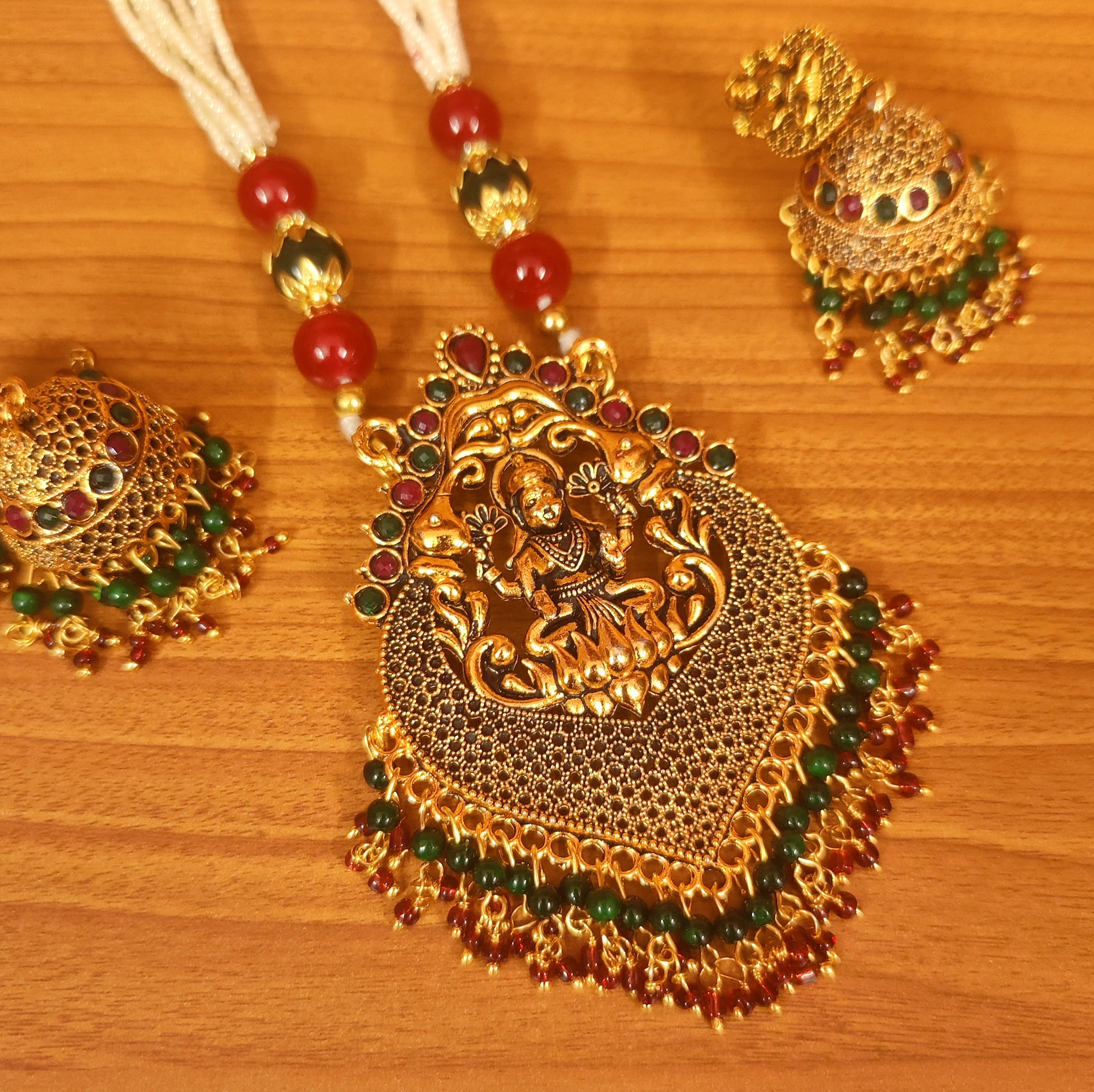 TEMPLE LOOK ANTIQUE GOLD PLATED MULTICOLOUR PENDANT SET