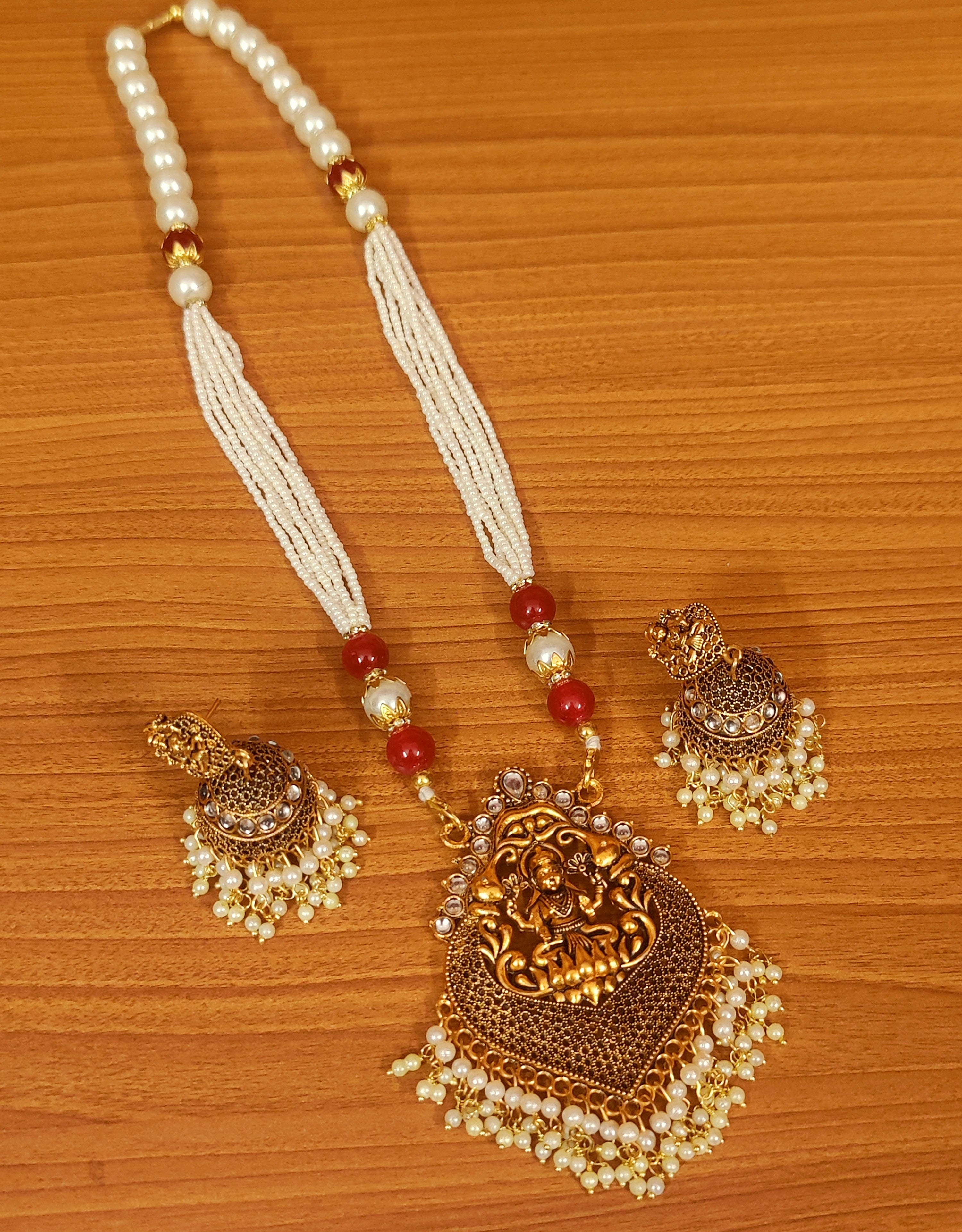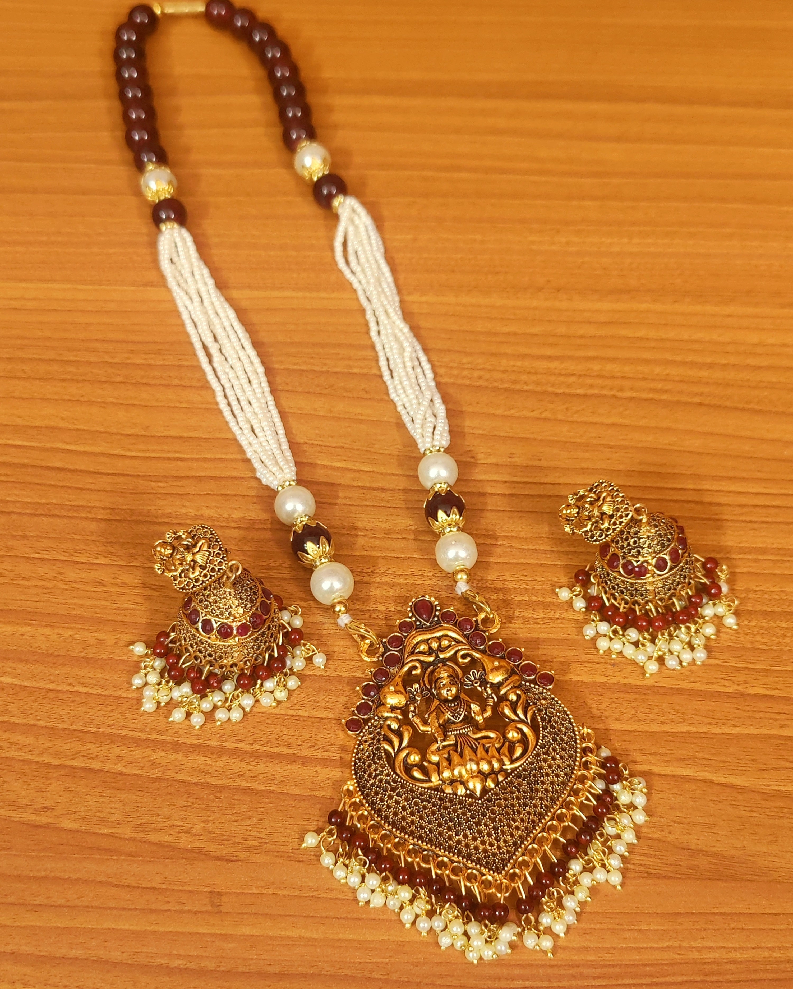 This temple look pendant set is handcrafted in copper alloy with imitation red & green stones & pearls of very fine quality. This beautiful pendant set is plated with fine 18kt nickle free antique gold rhodium that gives a real gold look to the design and comes with a pair of matching jhumka's which are very light in weight.