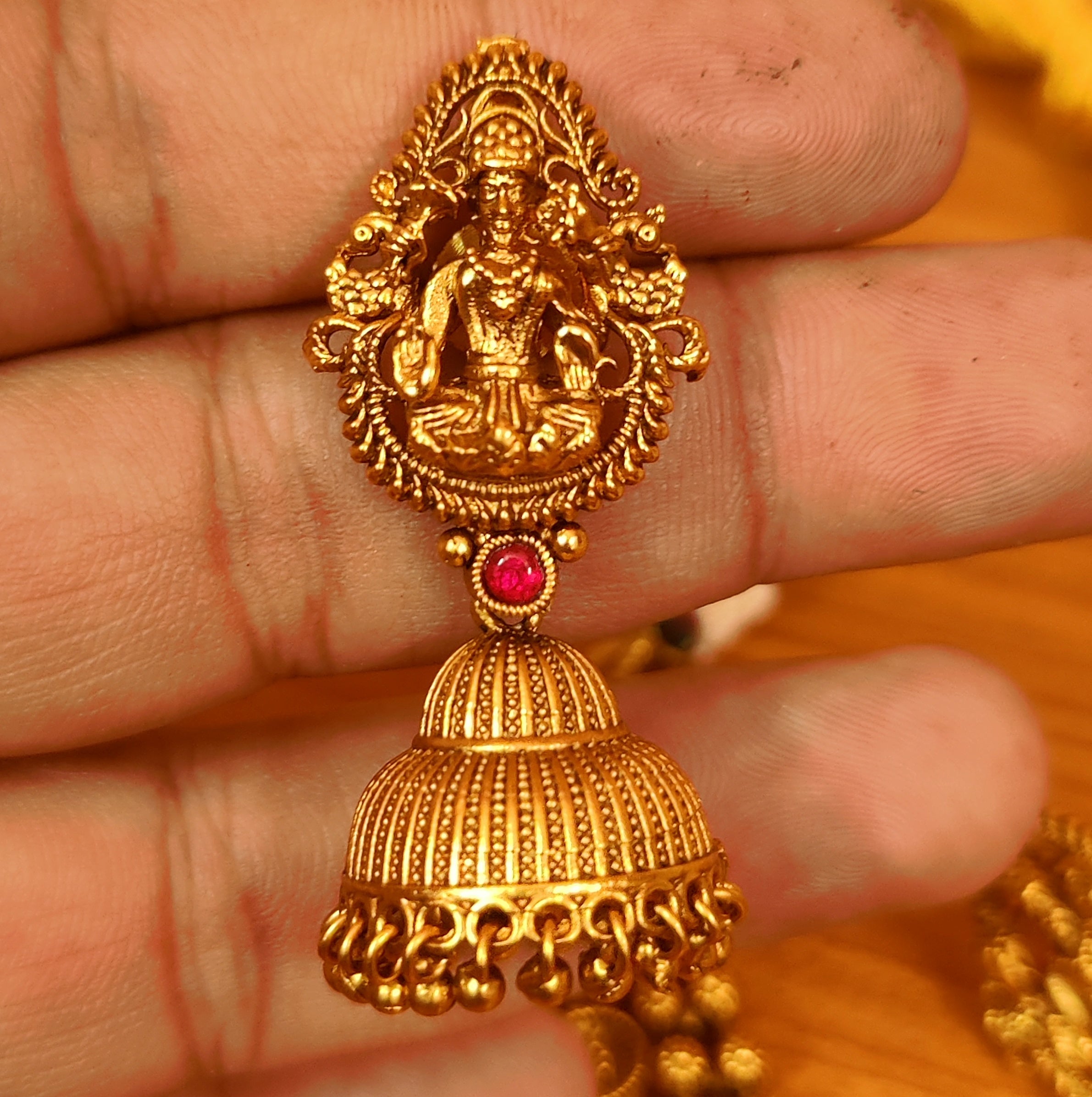 This beautiful goddess laxmi pattern necklace set is handcrafted in copper alloy with imitation red colour stone & gold polki work of very fine quality . this necklace set is coated with 18 kt gold rhodium plating that gives a real gold look . an absolutely stunning piece to own and are light in weight.