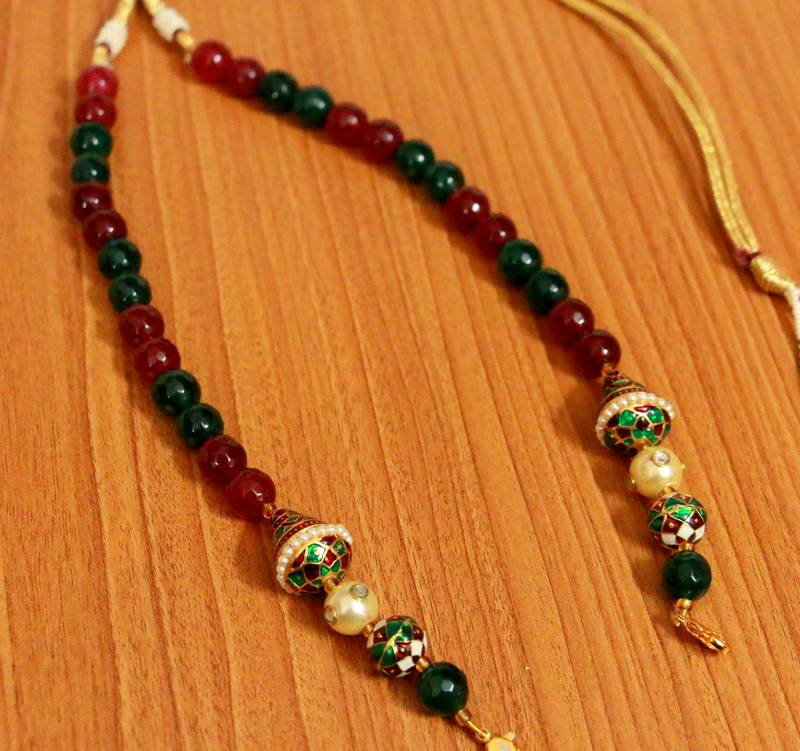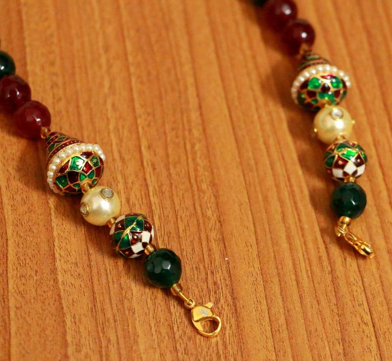 This beautiful necklace is handcrafted in brass alloy with imitation multi beads & meenakari work of very fine quality . This neckace is coated with 18 kt gold polish which give them a unique look . An absolutely stunning piece to own and are very light in weight.