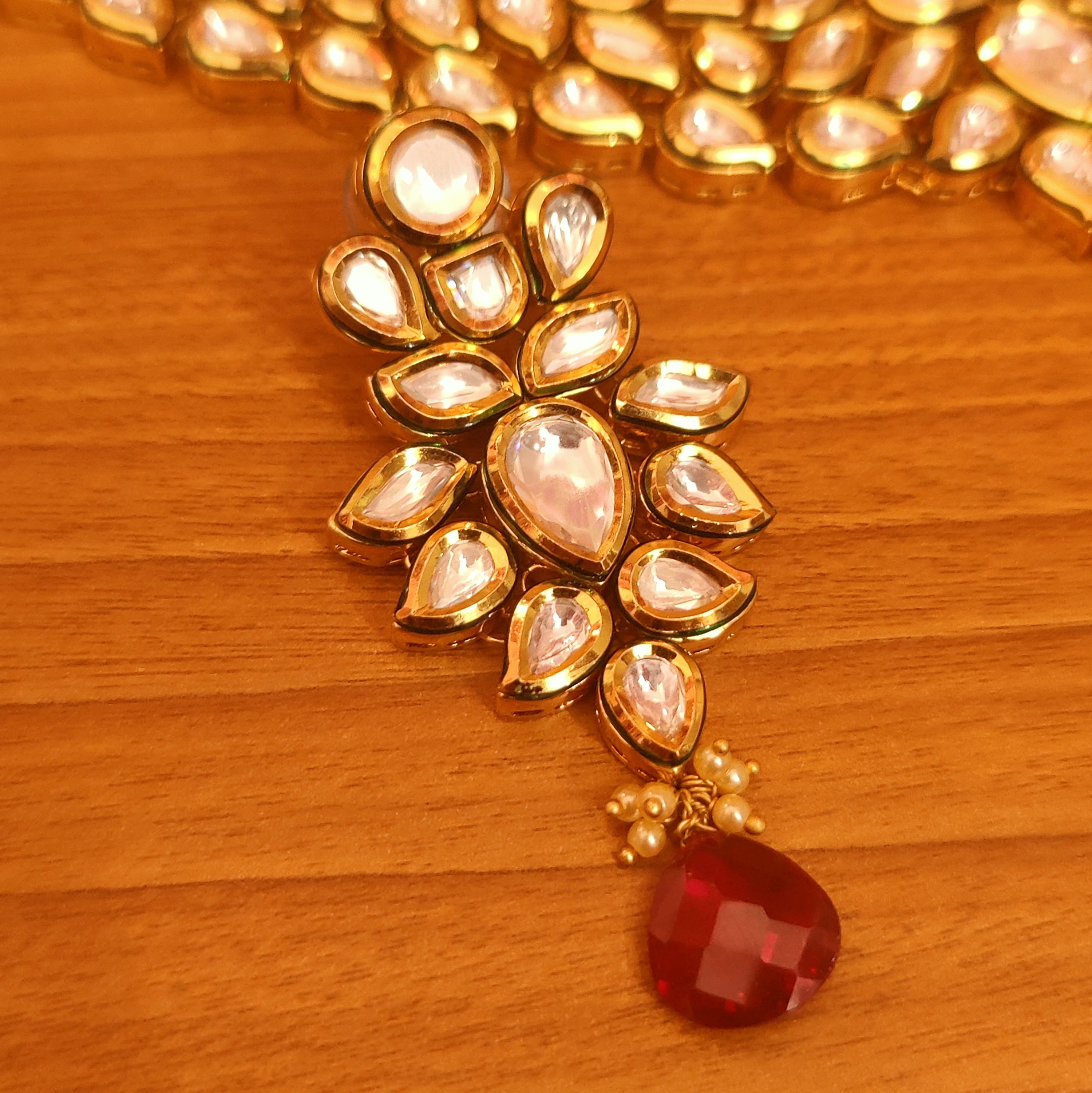 This beautiful necklace set is handcrafted in brass alloy with imitation ruby & kundan with meenakari work of very fine quality . This necklace set is coated with 18 kt gold polish which give them a unique look . An absolutely stunning piece to own and are very light in weight.