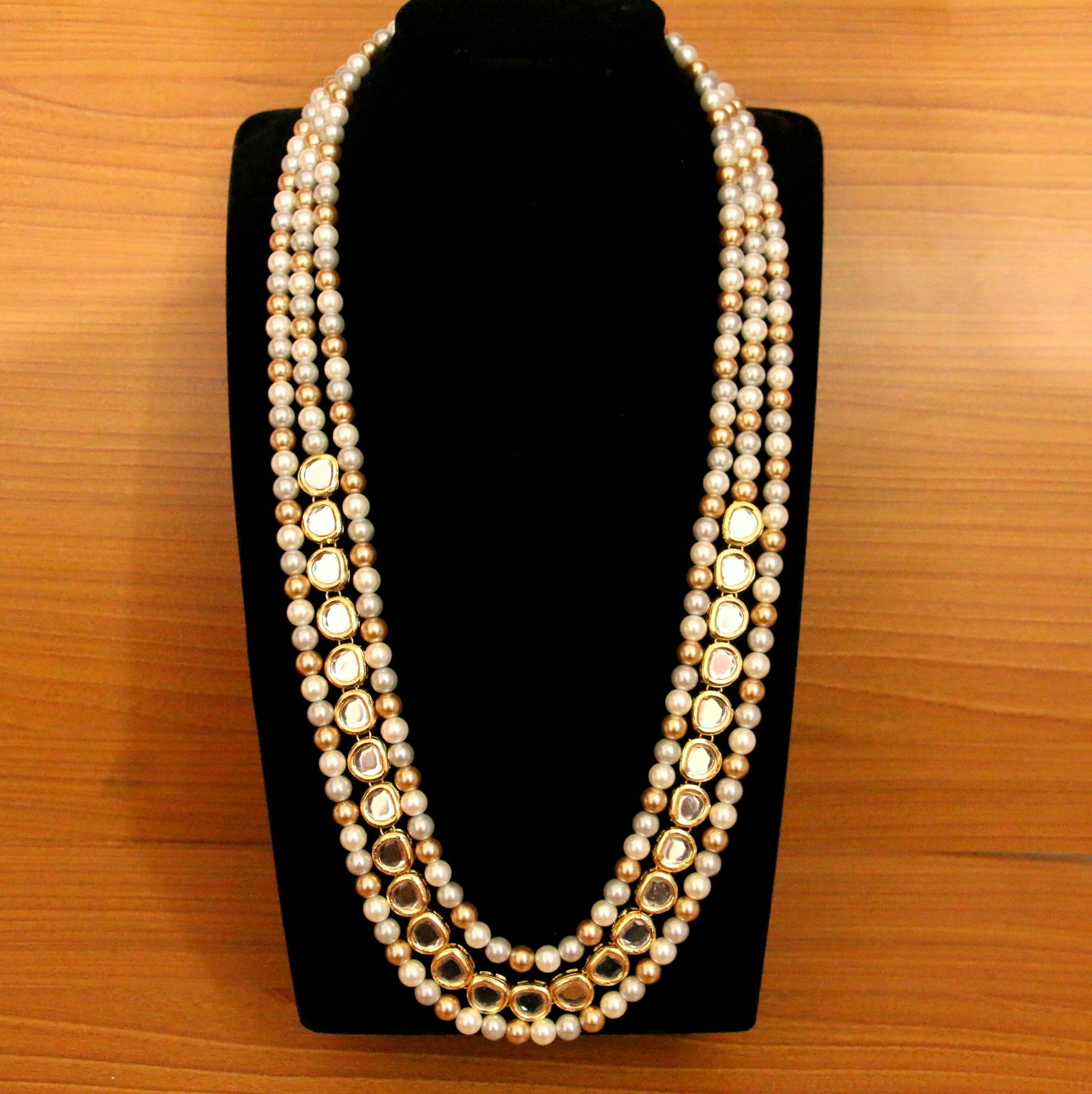 This long kundan polki pearl necklace set is handcrafted in silver alloy with imitation pearls & uncut kundan polki stones of very fine quality , the necklace set plated with 18kt gold rhodium to give it a real gold look.