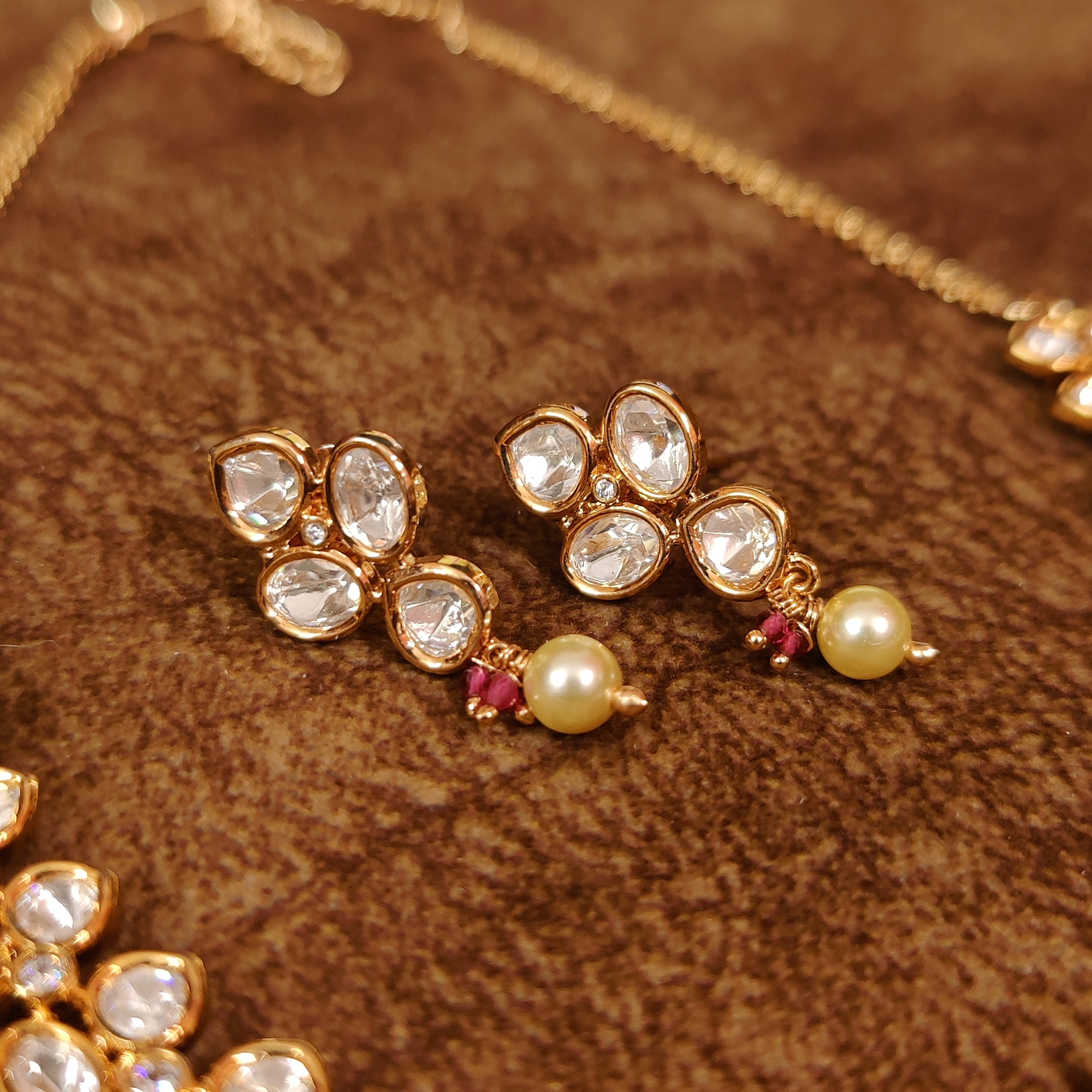 Introducing the kundan polki & pearl necklace - a stunning, gold-plated necklace set featuring exquisite kundan polki stones and delicate pearl bead accents. Perfect for weddings and special occasions, this lightweight necklace is not only beautiful but easy on the pocket.