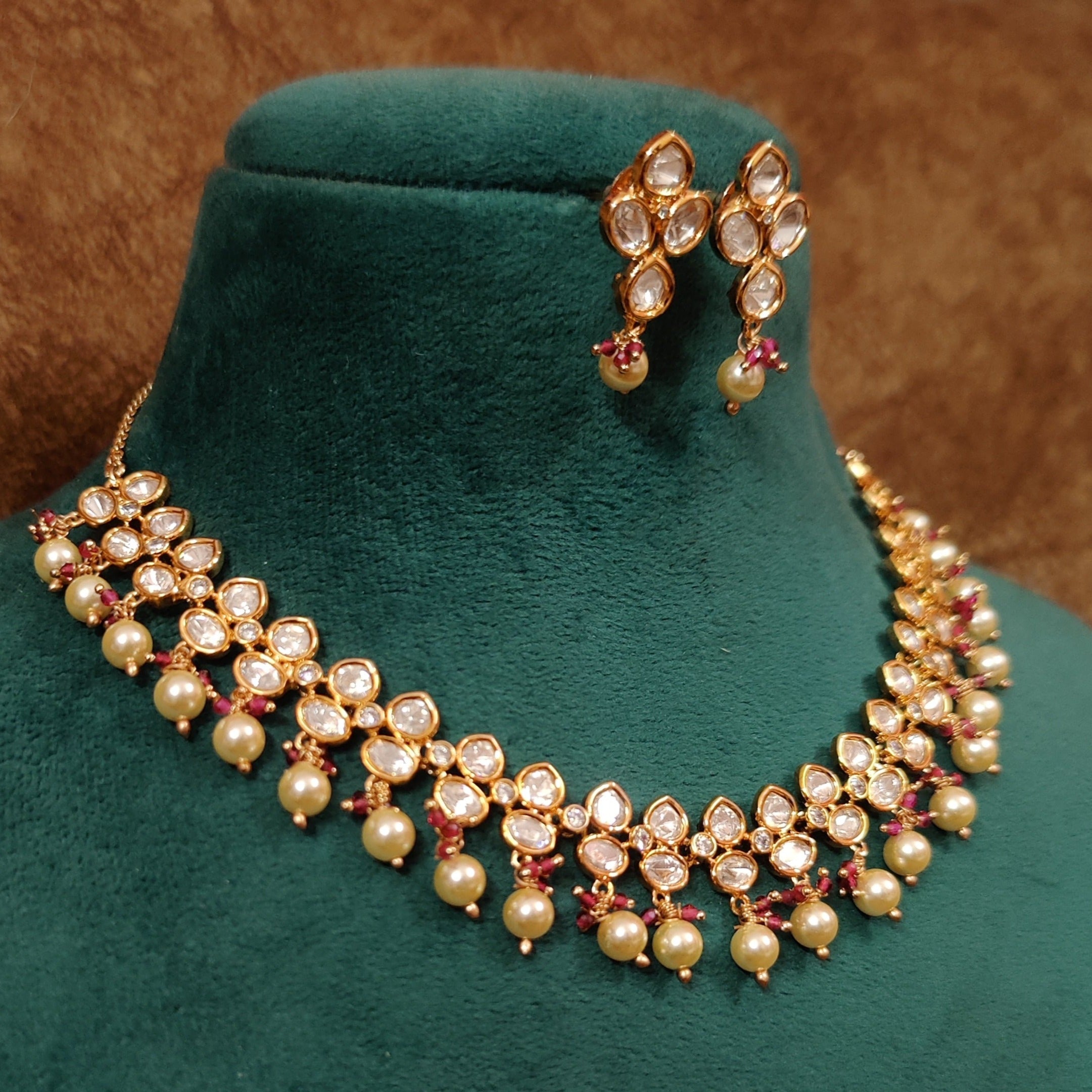 UNCUT KUNDAN POLKI NECKLACE WITH PEARLS & RUBY BEADS