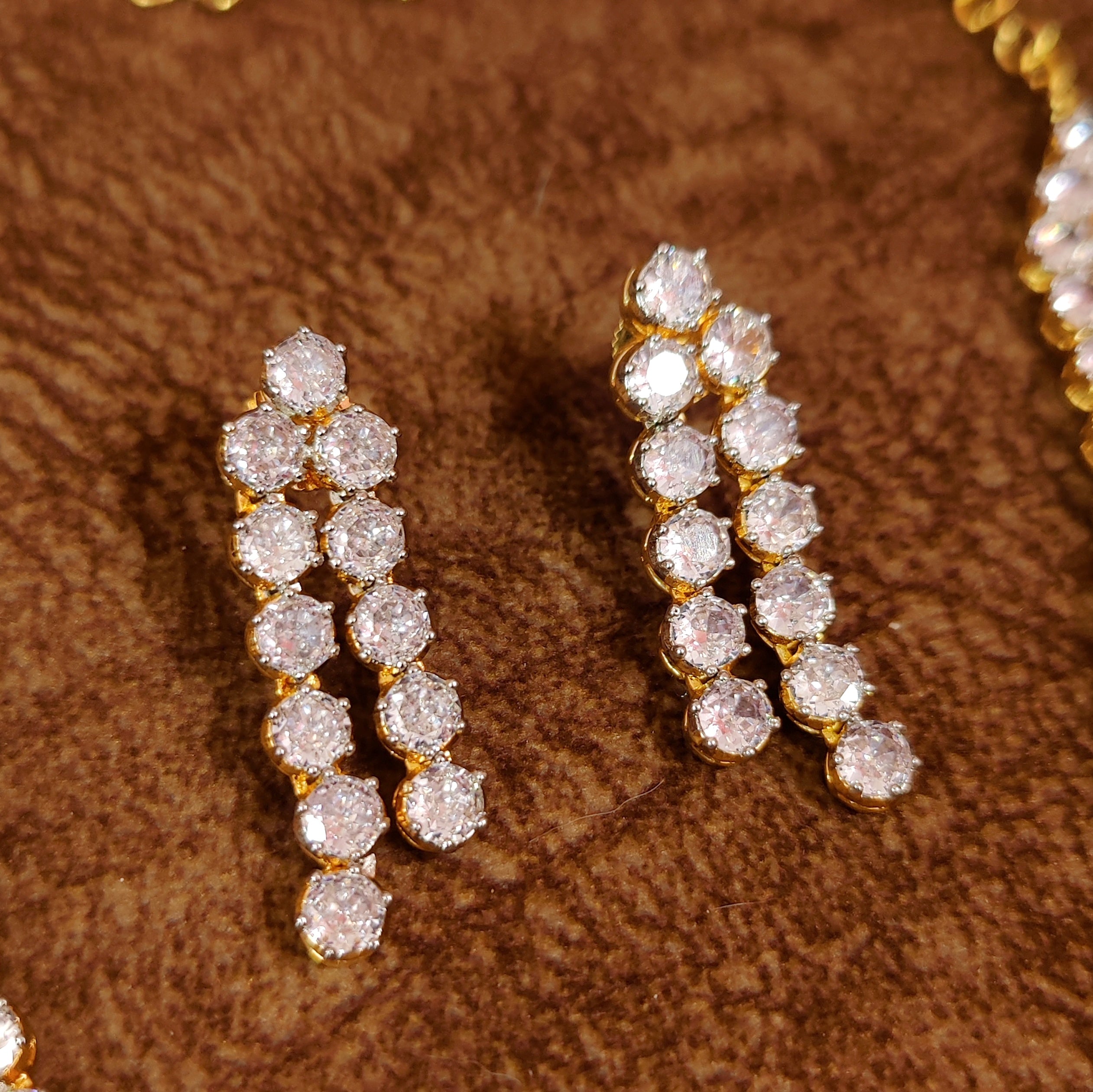 This beautiful necklace set is handcrafted in brass alloy with imitation american diamonds work of very fine quality . This necklace set is coated with 18 kt gold polish which give them a unique look . An absolutely stunning piece to own and are very light in weight.