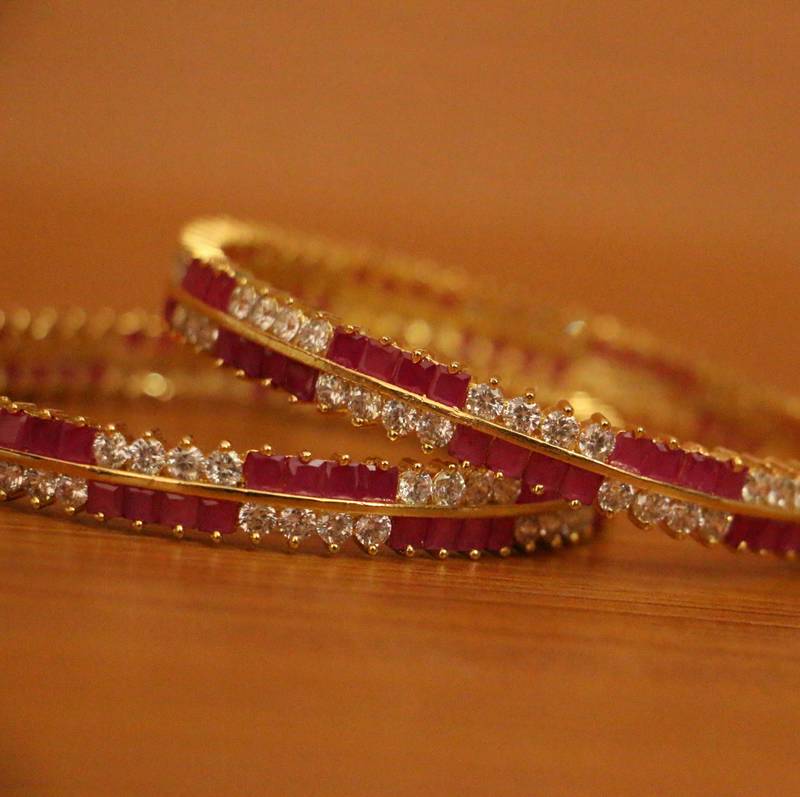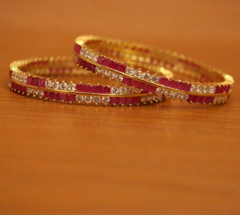 These bangles are handcrafted in silver & brass alloy with imitation red ruby & cz stones work of very fine quality. These artistic yet modern bangles are plated with fine nickle free gold rhodium to avoid any allergies to the skin.