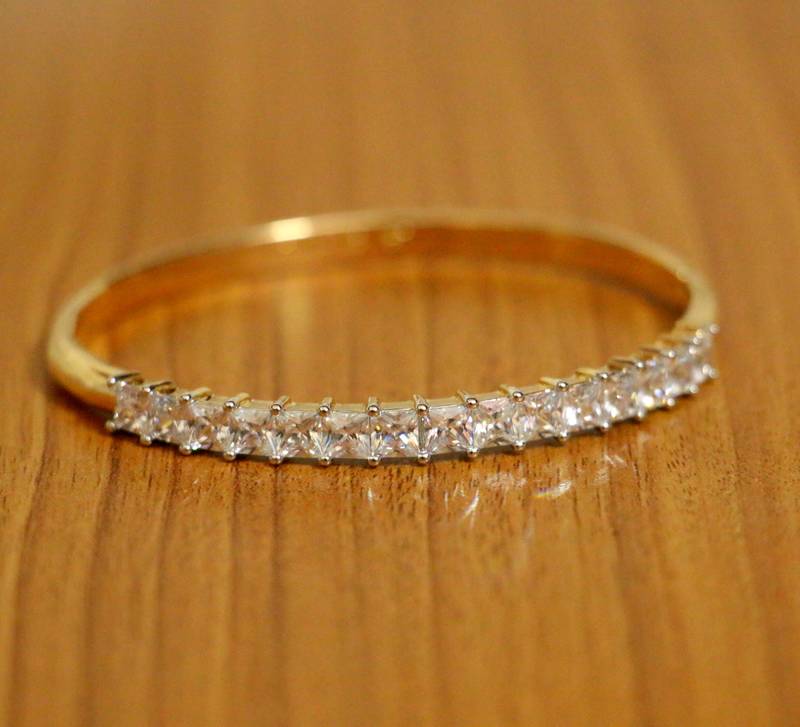 This beautiful bracelet is handcrafted in brass alloy with imitation american diamond work of very fine quality . This bracelet is coated with 18 kt gold polish which give them a unique look . An absolutely stunning piece to own and are very light in weight.