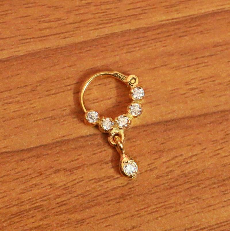 This nose ring is handcrafted in silver alloy with imitation american diamond stones of very fine quality , this nose ring is coated with 18kt nickle free gold plating to avoid skin allergies and its very light in weight .