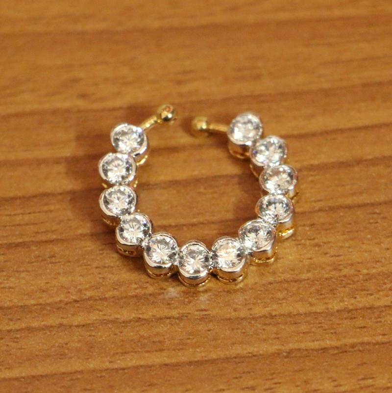This Diamond Look Nose Ring Is Handcrafted In Silver Alloy With American Diamond Stones Of Very Fine Quality . This Nose Ring Is Coated With 18kt Gold Nickle Free Polish To Avoid Skin Allergies . An Absolutely Stunning Piece To Own And Are Very Light In Weight.