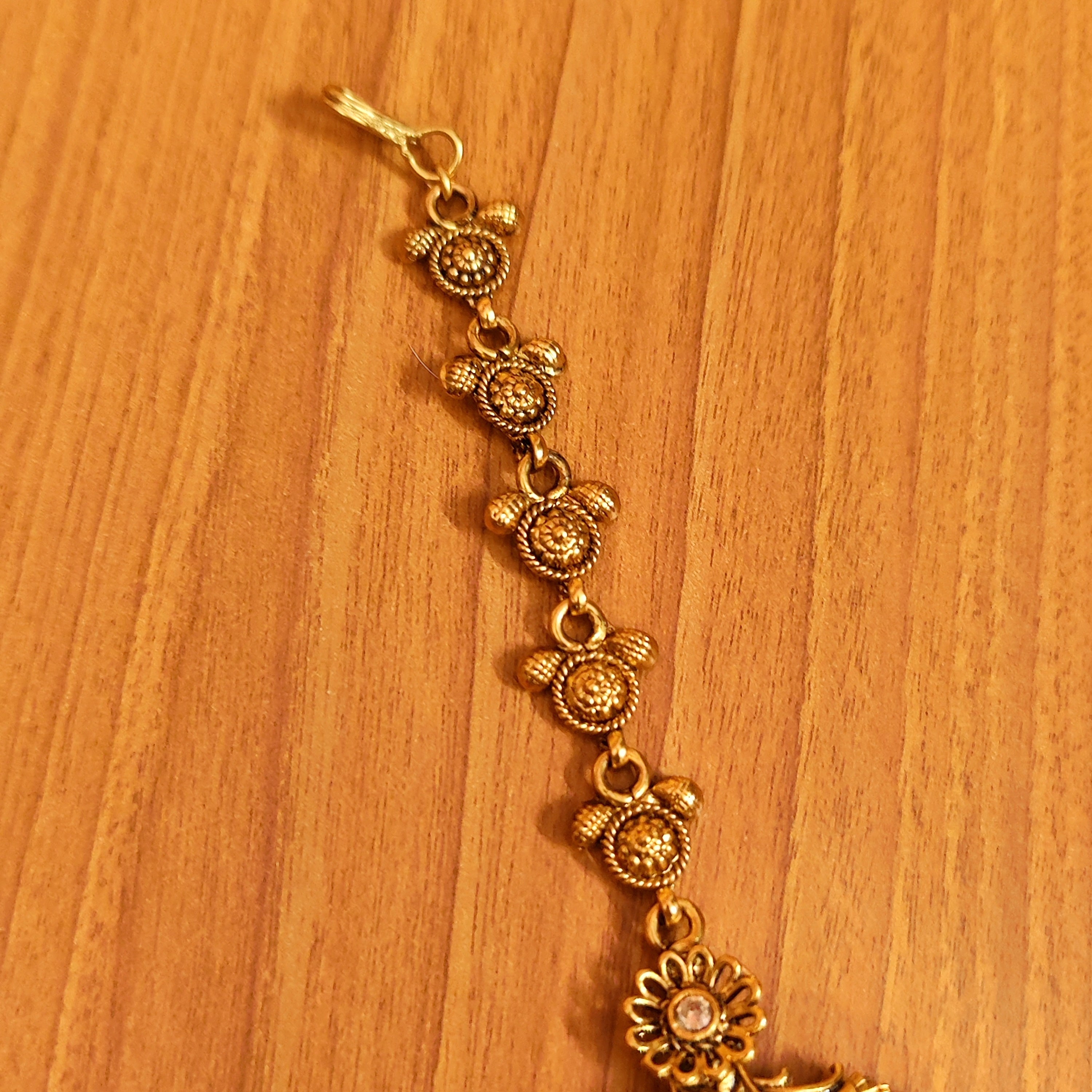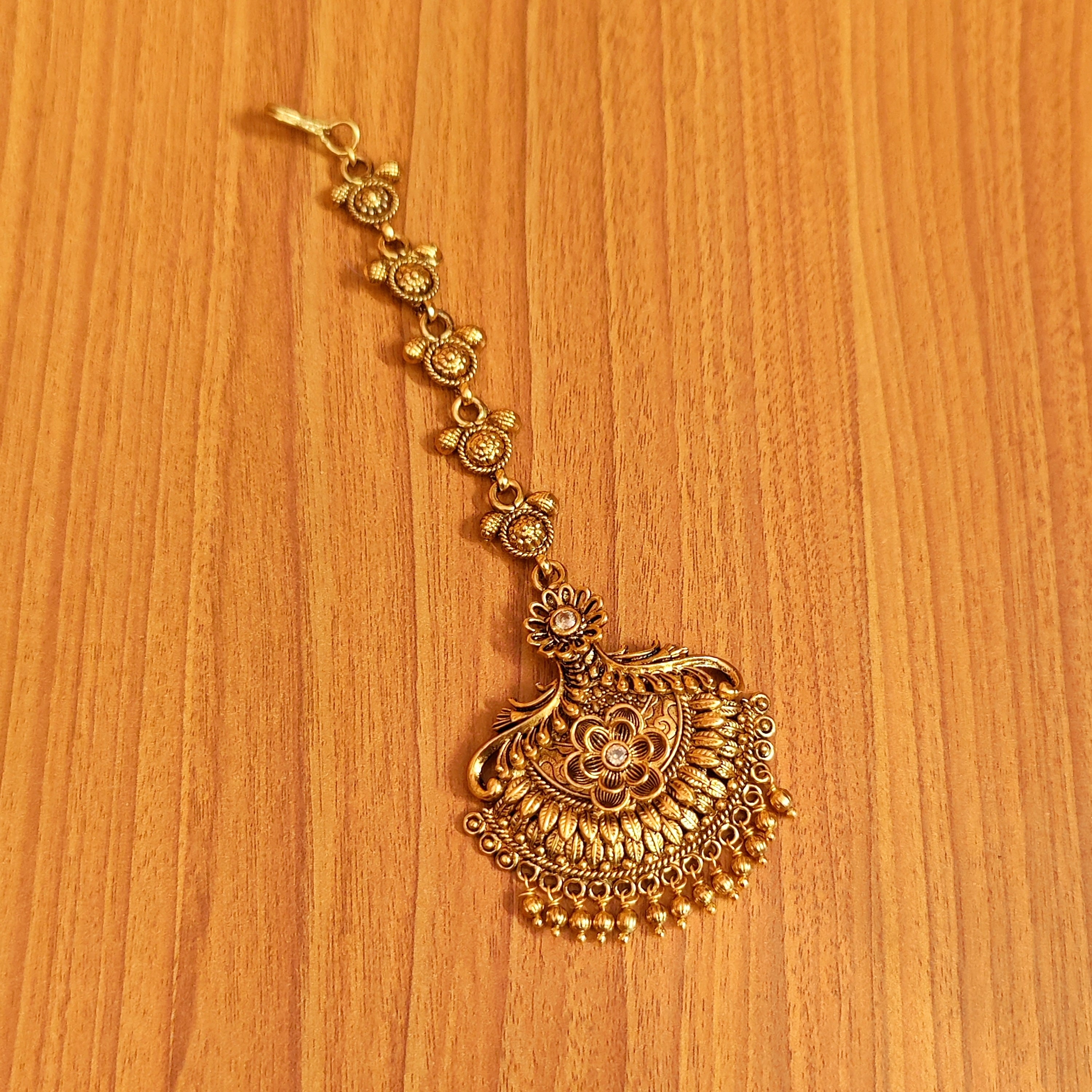 This beautiful bridal look mathapatti is handcrafted in copper alloy with minute & intricate gold work of very fine quality . This mathapatti is coated with 22 Kt matt gold plating which gives a very real look to the design . An absolutely gorgeous piece and is very light in weight.