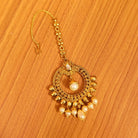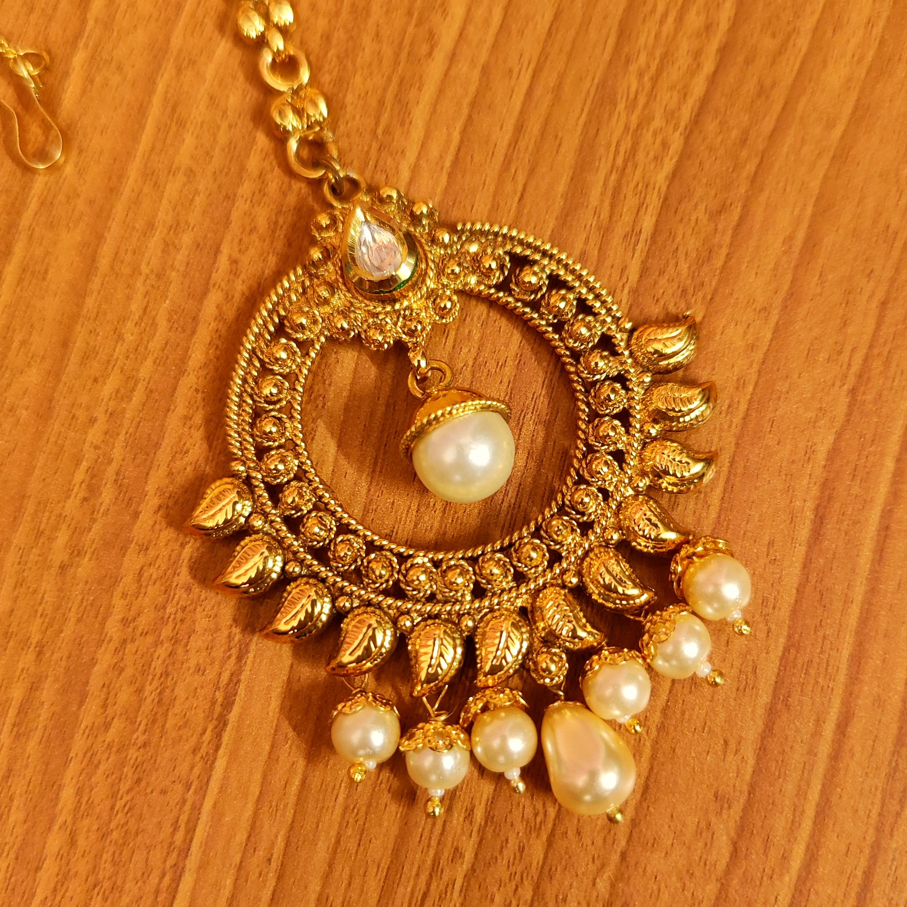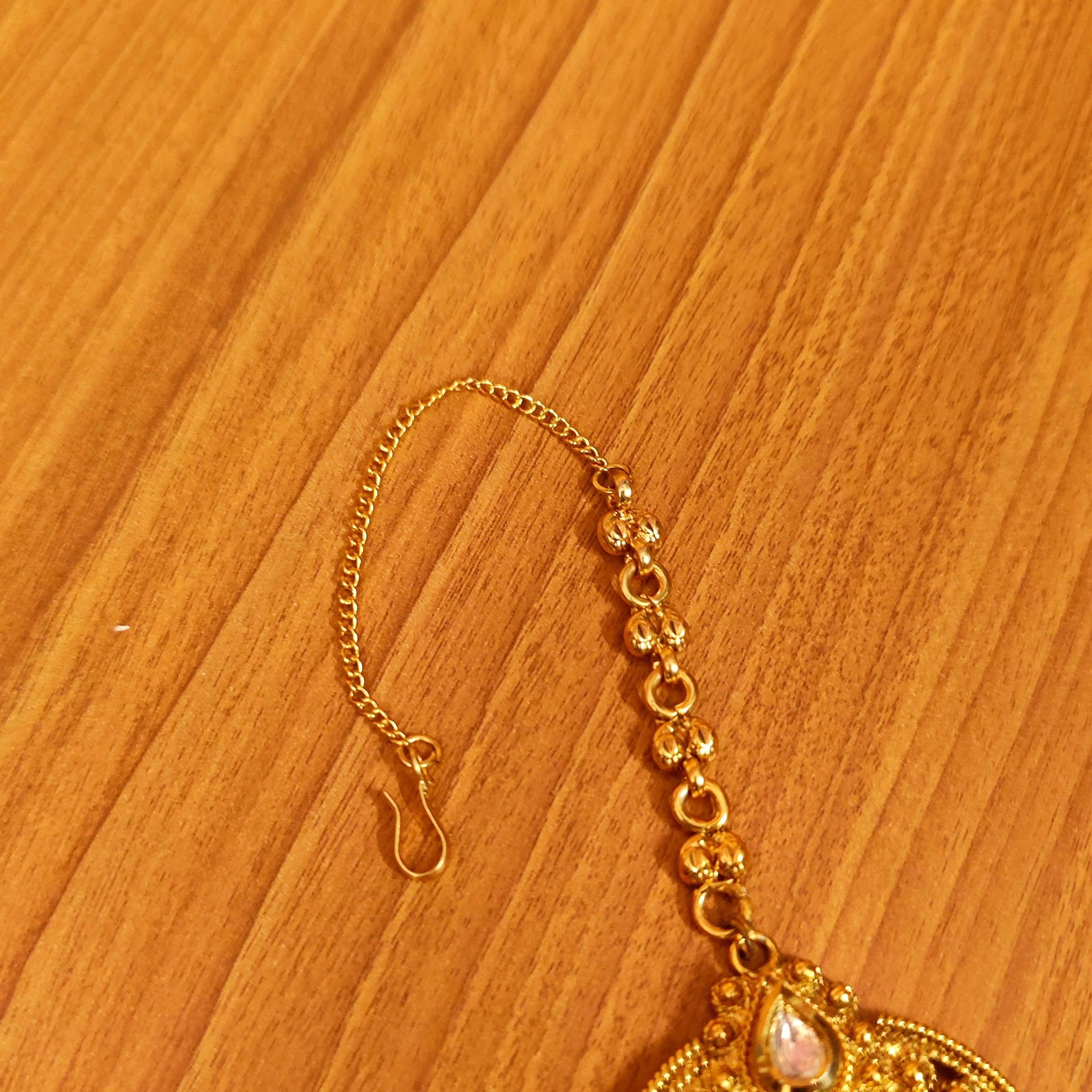 This beautiful bridal look mathapatti is handcrafted in copper alloy with minute & intricate gold work of very fine quality . This mathapatti is coated with 22 Kt matt gold plating which gives a very real look to the design . An absolutely gorgeous piece and is very light in weight.