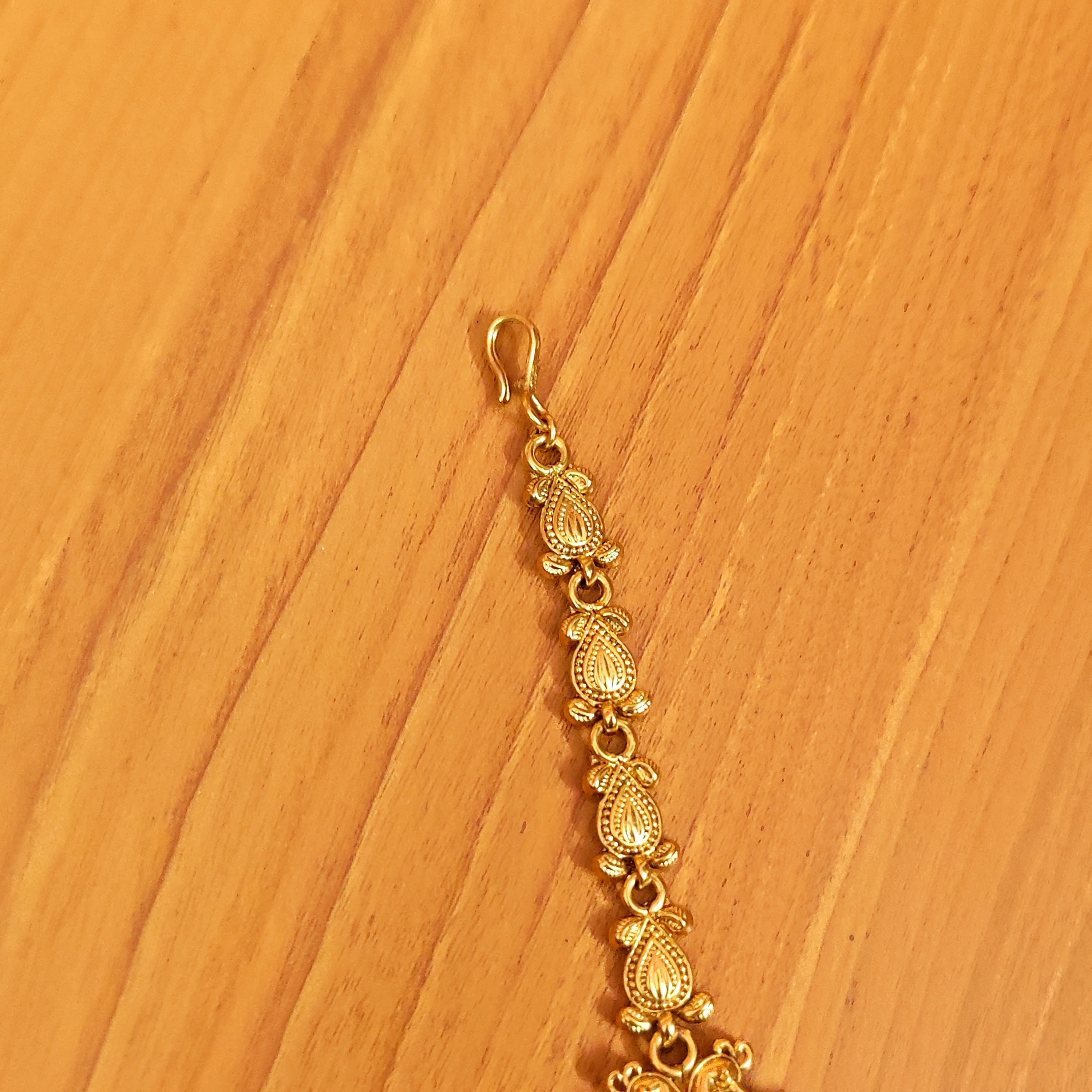 This beautiful bridal look mathapatti is handcrafted in copper alloy with minute & intricate gold work of very fine quality . This mathapatti is coated with 22 Kt matt gold plating which gives a very real look to the design . An absolutely gorgeous piece and is very light in weight.
