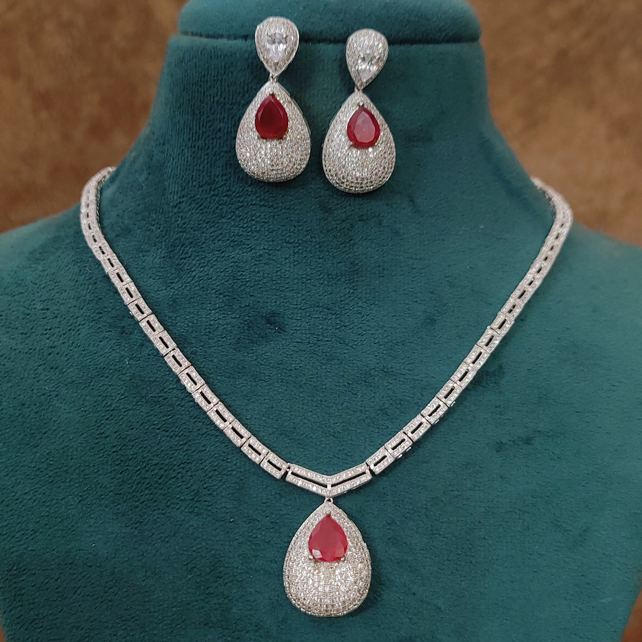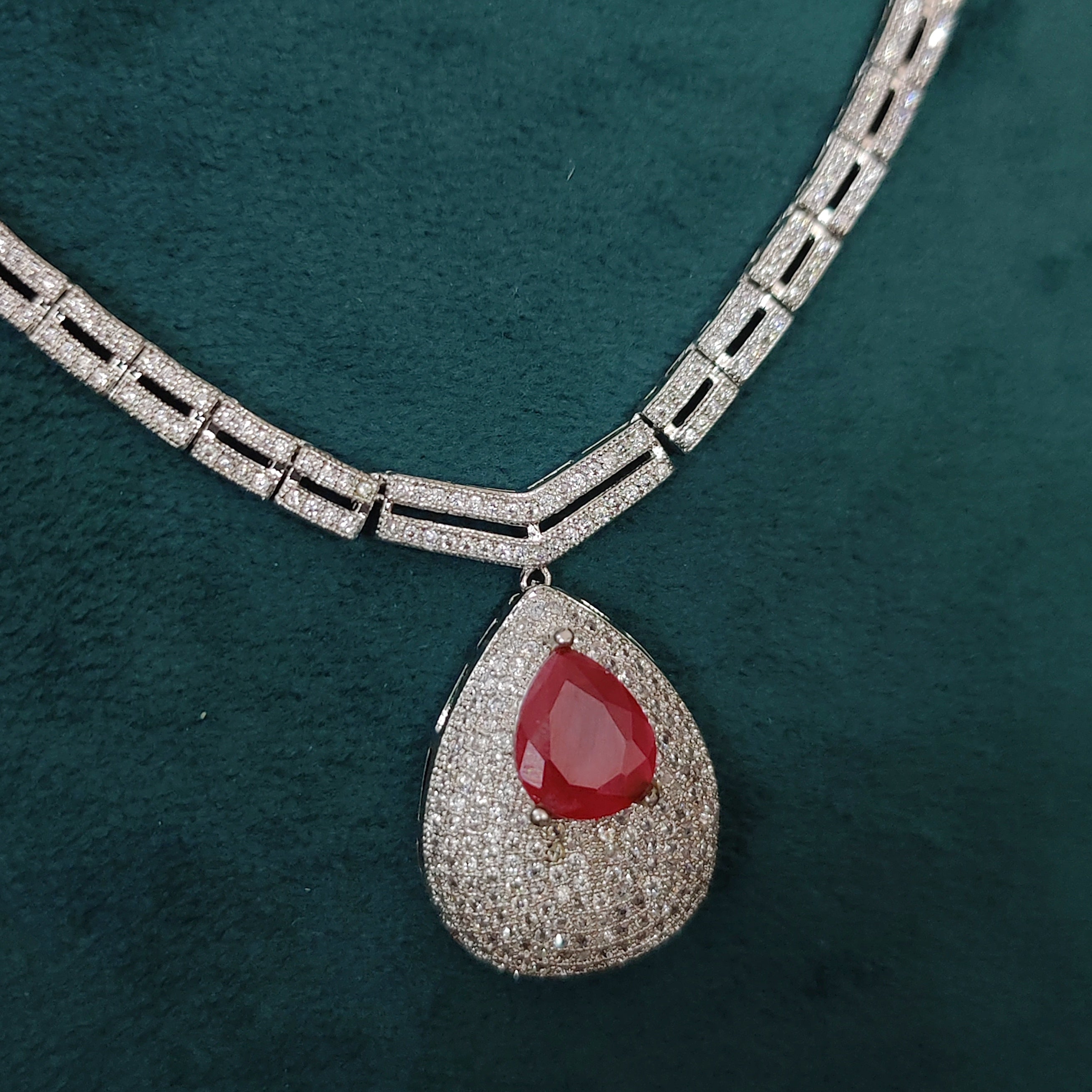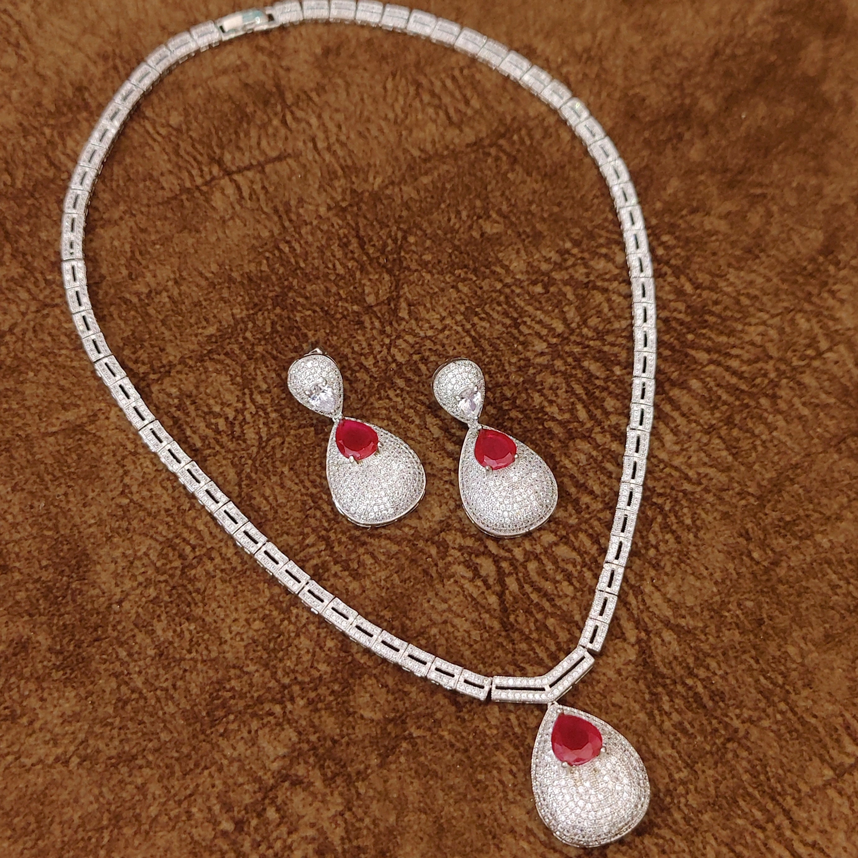 Turn heads with the Black Silver Diamond Look Dark Ruby Necklace Set, a captivating fusion of elegance and mystery. This stunning set features deep ruby stones set in a sleek black silver finish, creating a luxurious contrast. The diamond-like detailing adds a sparkling touch, making it perfect for evening events and special occasions. Elevate your style with this statement piece that speaks of timeless sophistication.